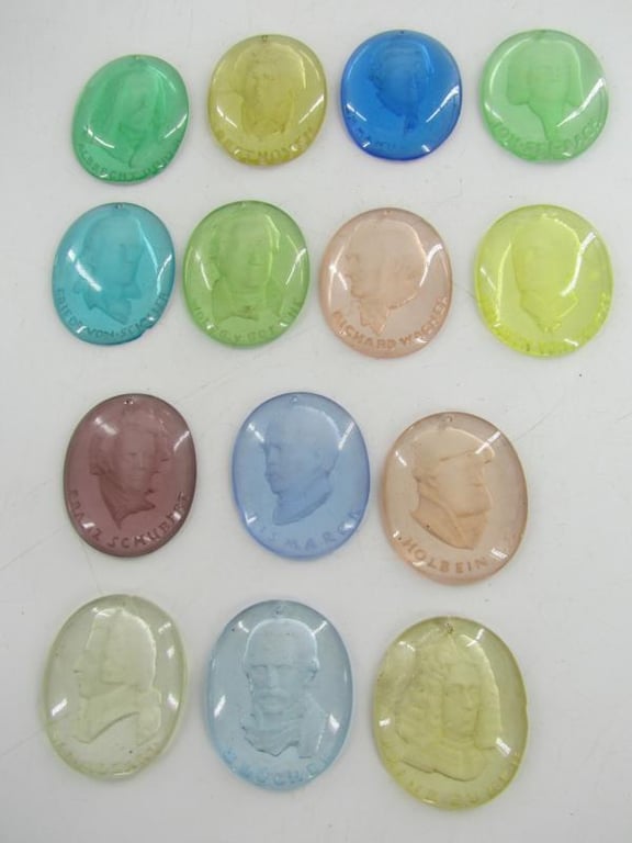 group of 14 Winterhilfswerk gift tokens, 1 3/8" tall glass portraits of famous Germans,