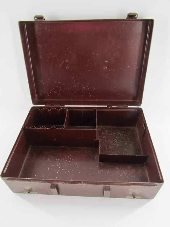 Rare original metal box for the Beleuchtungsgerät für Strichplatte or lightning for graticule. The box would contain the famous headlight (Stirnlampe), multiple batteries, cables and spare bulbs wich would be used to light the reticle lighting in various optics.