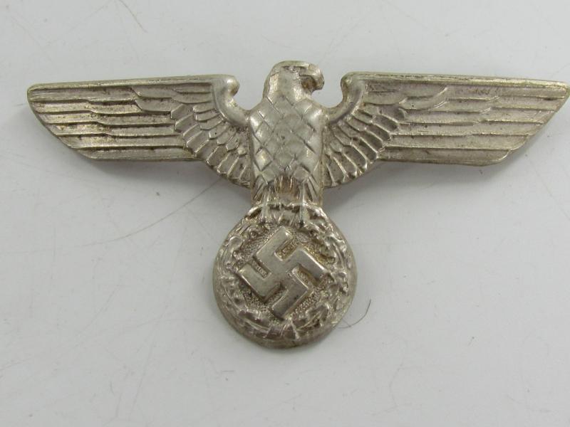 A Third Reich German Political Cap Eagle, constructed in aluminum; with rzm stamp and marked RZM/20 which indicates maker Gustav Emil Ficker