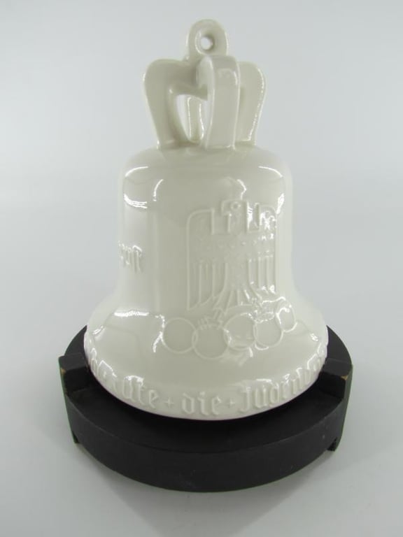 On the lower end of the bell is written: “11. Olympische Spiele Berlin – Ich rufe die Jugend der Welt” (11. Olympic Games Berlin – I call the youth of the world, with two swastika’s).