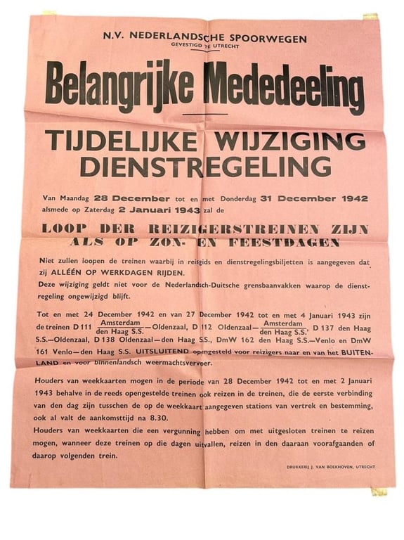 original leaflet from 1942 with a communication from the Dutch railways about a temporary change in the timetable