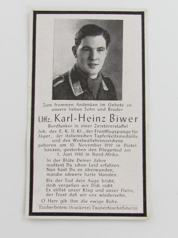 This is a deathnotice for "Karl Heinz Biwer" who was an 'Unteroffizier' within the Luftwaffe