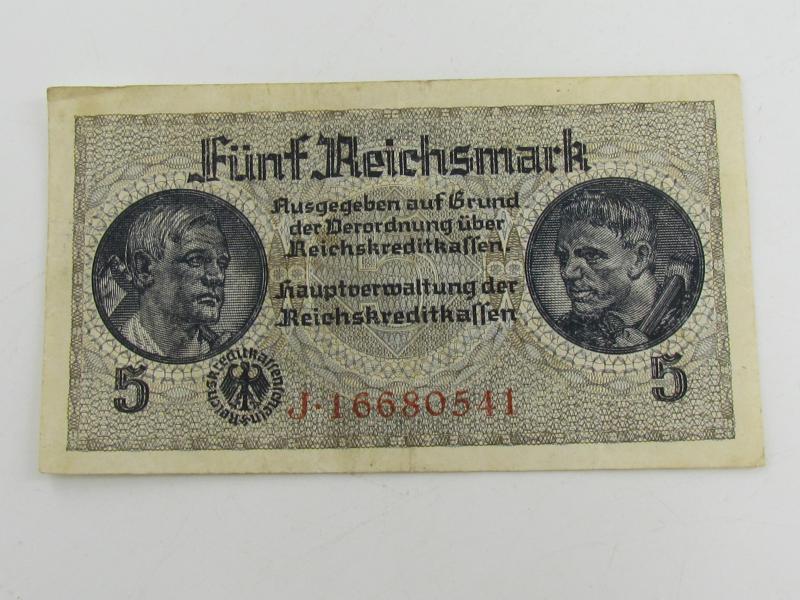 Occupation Reichsmarks for the Eastern Territories 5 Reichsmark ausgegeben aufgrund der Verordnung über Reichskreditkassen Hauptverwaltung der Reichskreditkassen.