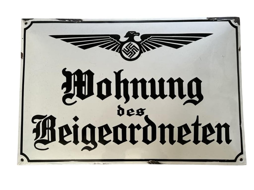 German WWII White Enameled Sign-This is a large sign that is made of steel and has a white enamel overcoat. It has gothic script in black that reads “Wohnung des Beigeordneten” or “Apartment of the (Nazi Party) Deputy”. This plaque was affixed to the facade of the house of the 1st Assistant to the Mayor.