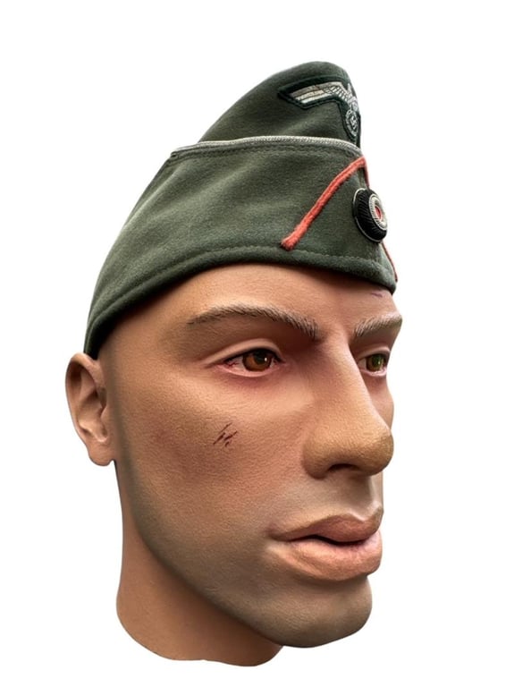 M34 pattern privately purchased officers overseas cap (Schiffchen für Offiziere) for a member of a Panzer(Jäger) unit. Genuine applied insigia up front, surrouned by a pink soutache for Panzer troops.