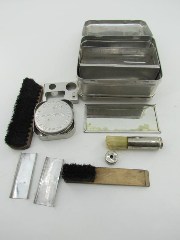 Rare original Wehrmacht Personal "Mica" Kit' (Soldaten Wirtschaftskasten). This kit was stored inside the mess kits and would contain all necessary personal items. The kit is complete with it's original inner frame. The aluminum kit is nicely marked with 'Mica' and nicely 'D.R.Patent, Auslandspatente' marked.