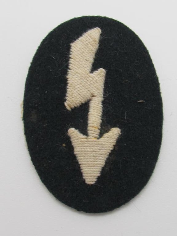 hand-embroidered white coloured lightning blitz on an oval base of darkgreen woolen badge cloth