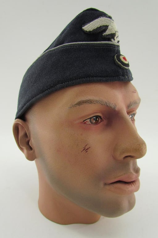 Luftwaffe Officer's Overseas Cap (Schiffchen für Offiziere). Luftwaffe blue/grey woolen construction Enlisted Men's type overseas cap which has been upgraded for officer's usage, having silver piping for officers ranks along the top edge of the fold down panels. The cap is having an original applied cap-eagle and black/white/red national tri-color cockade. The insignia are neatly period hand applied.