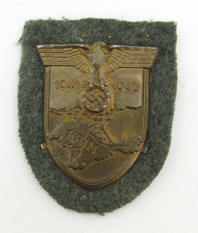 Wehrmacht Heer Krimschild. Constructed of bronzed magnetic metal, the obverse consisting of a shield bearing a map of Crimea and southern Ukraine, topped by a Wehrmacht eagle clutching a wreathed mobile swastika, flanked by dates “1941-1942”, affixed with four side prongs to a magnetic metal backplate with a field-grey wool liner, unmarked but demonstrating the characteristics of a variant attributed to Rudolf Souval, Vienna,