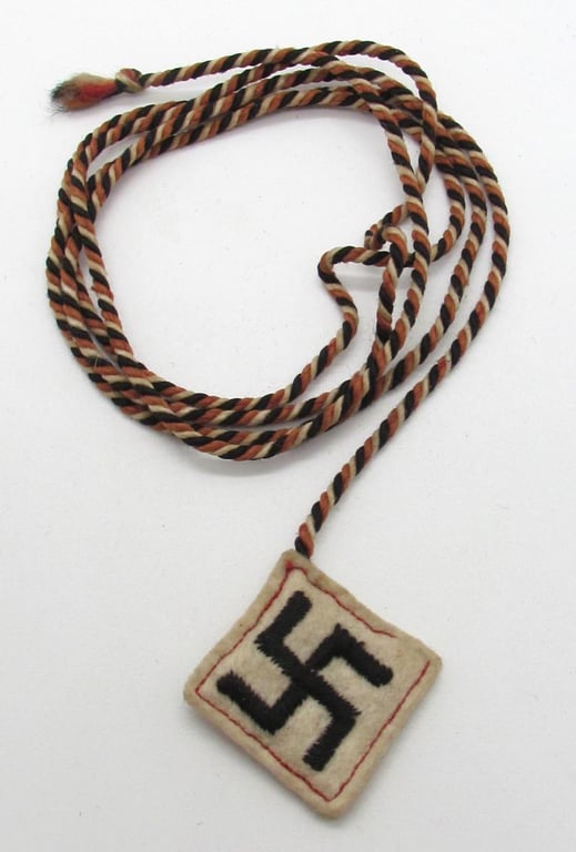 Original 1930s WHW donation item consisting of a red-white-black twisted cord with a felt pendant featuring a hand-stitched swastika motif. Such inexpensive souvenir items were distributed during Winterhilfswerk street collections as a token of gratitude for contributions.