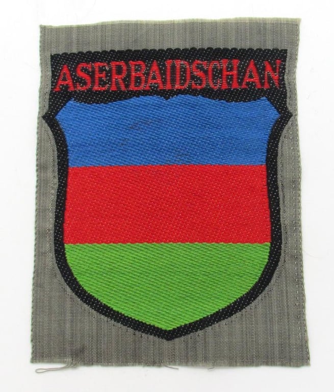 In 1942 an identifying sleeve shield for members of the Aserbaidschan legion was introduced. The shield is executed in the neat so-called BeVo weave style on a field-grey linnen background.