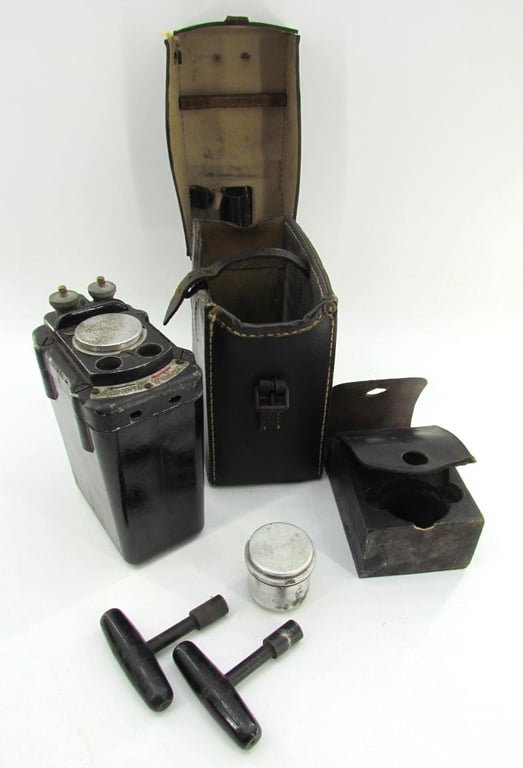 These are all stored along with the detonator in the original leather case.The case has become a bit worn over the years and is also missing the carrying strap and closure strap