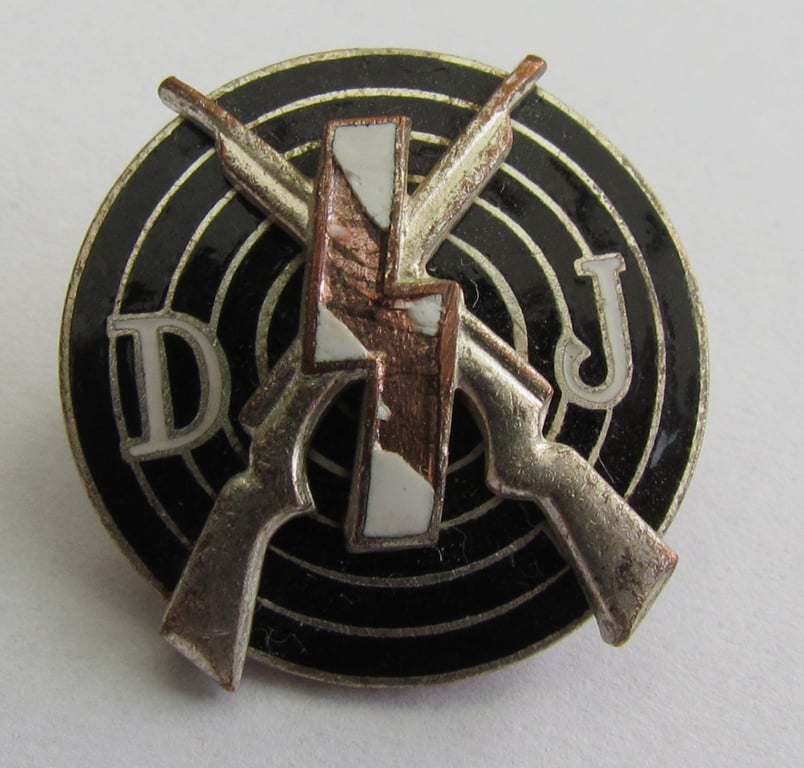 A rare and original example of the Deutsches Jungvolk (DJ) Shooting Proficiency Badge , awarded to younger members of the Hitler Youth for marksmanship.
