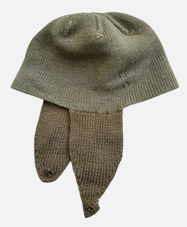 An original US Army wool knit winter cap featuring integrated ear flaps with functional snap fasteners. This type of cold-weather headgear was designed to be worn under a steel helmet, providing additional warmth and protection in harsh conditions.