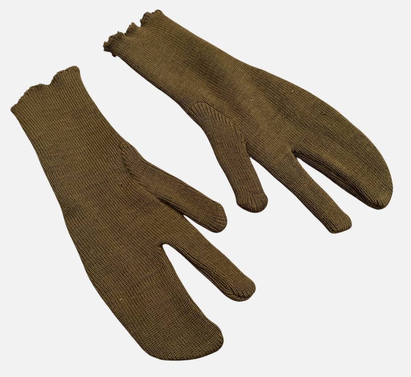Original pair of military wool “trigger finger” gloves in classic olive drab color. These gloves feature the distinctive split-finger design, allowing the wearer to operate a firearm while keeping the rest of the hand protected from cold weather.