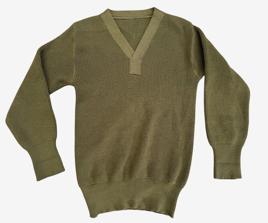 Original U.S. Army olive drab wool sweater, classic WWII pattern with V-neck. This is the well-known military issue style worn by American troops during the Second World War, typically used as a warm layer under field jackets such as the M41 and M43.