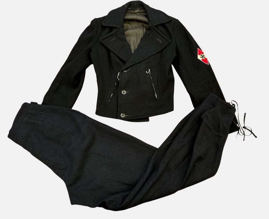 The garments show typical signs of age and wear consistent with wartime textiles. Overall, a rare and visually striking ensemble representing the intersection of civilian sportswear and youth organization use in WWII Germany.