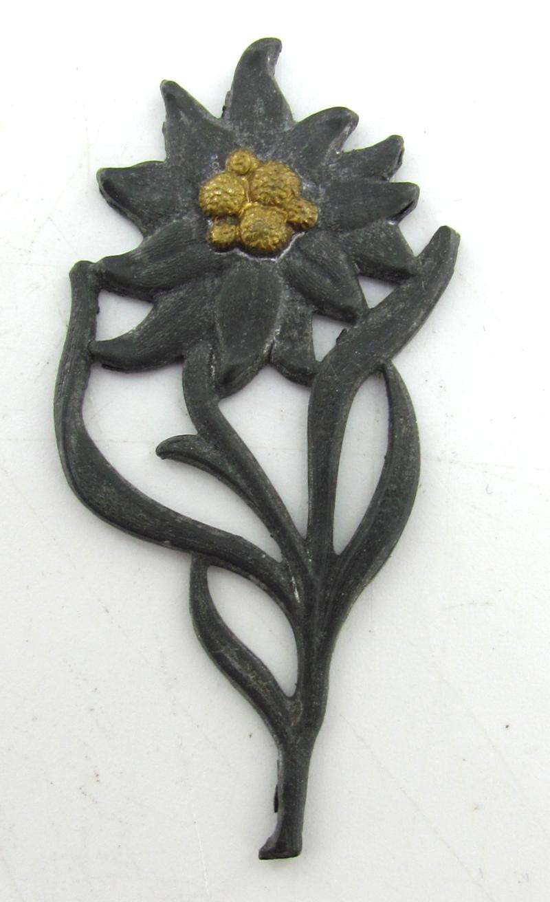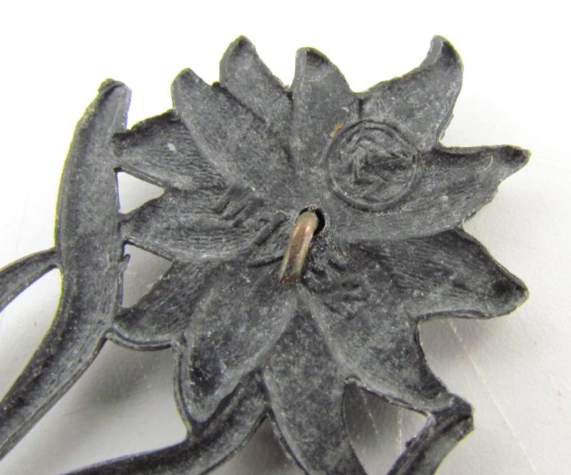 original aluminum made ‘political’ edelweiss either used for SA or Hitlerjugend units stationed in the Alps. Maker marked by RZM M1/152 (Franz Jungwirth, Wien)