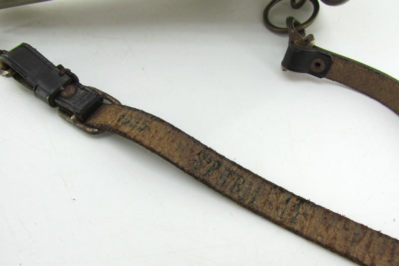Original SA (Sturmabteilung) signal horn, manufactured in brass with the embossed National Socialist eagle, oak leaf wreath, and swastika emblem. Complete with its original blackened leather carrying strap and iron hooks, stamped “1935 Sturm 11 D.R.G.M.”.