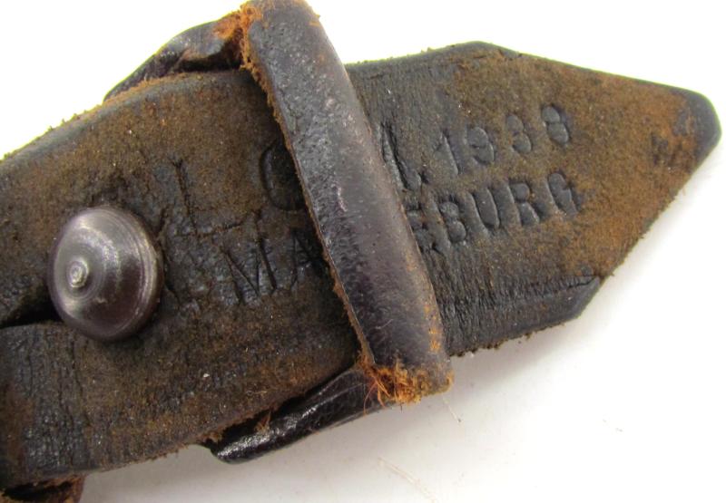 The brown leather sling is maker marked and dated 1938