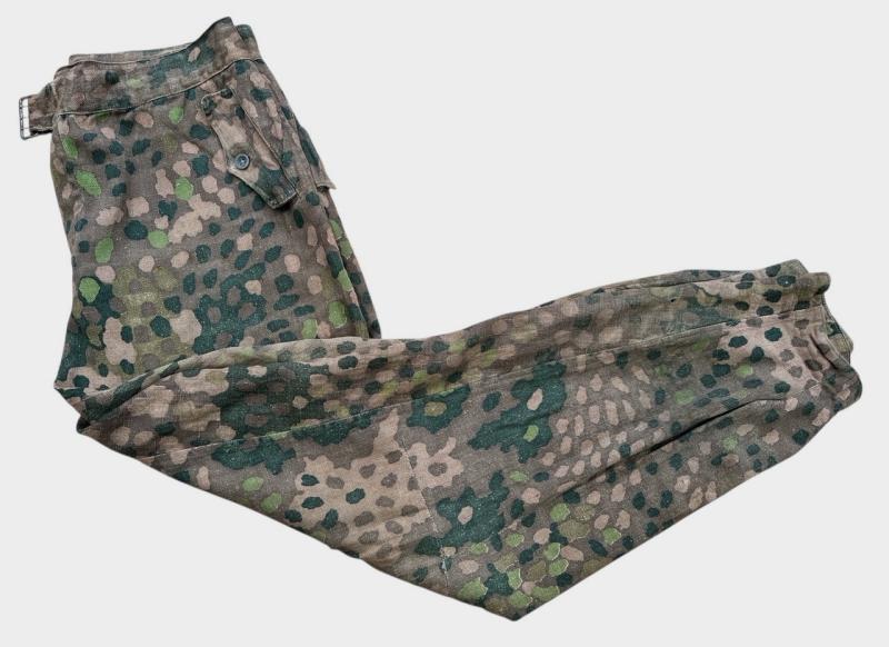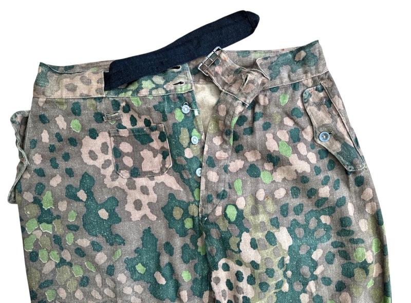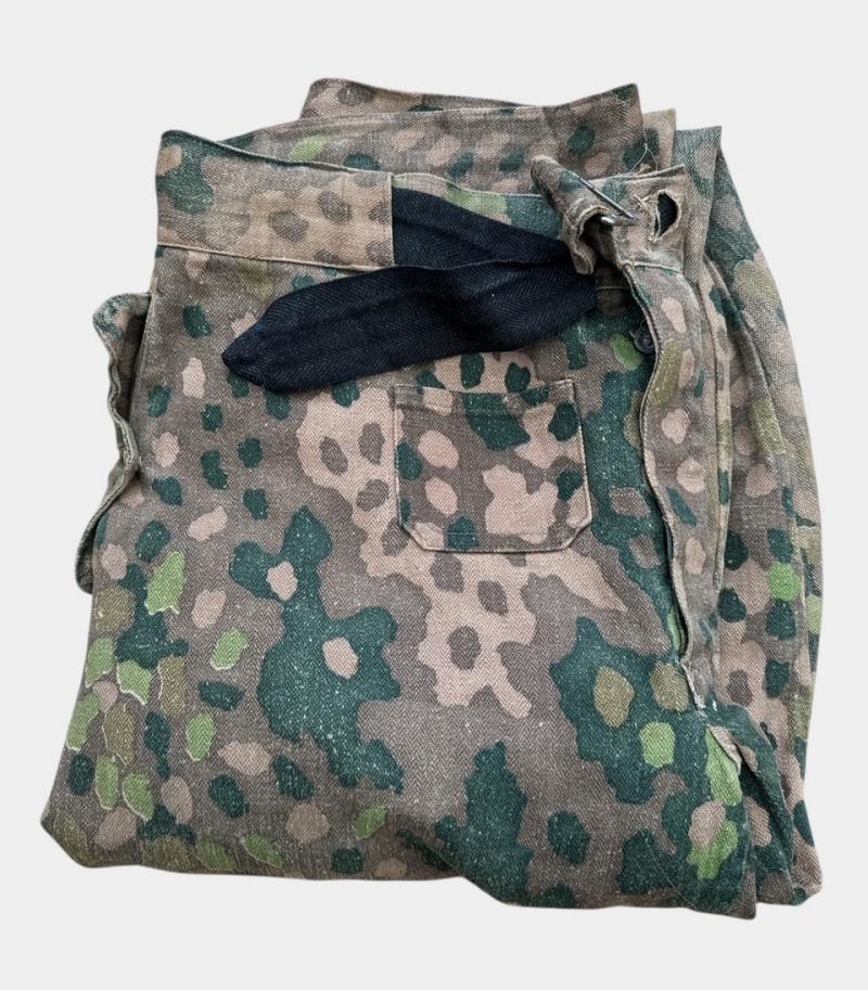 A well-preserved pair of Waffen-SS Panzer trousers in the classic late-war Erbsentarn (pea-dot) camouflage pattern. Made of strong HBT material and cut in the typical tapered Panzer style, with ankle slits, internal waist adjustment straps, and the characteristic pocket configuration.