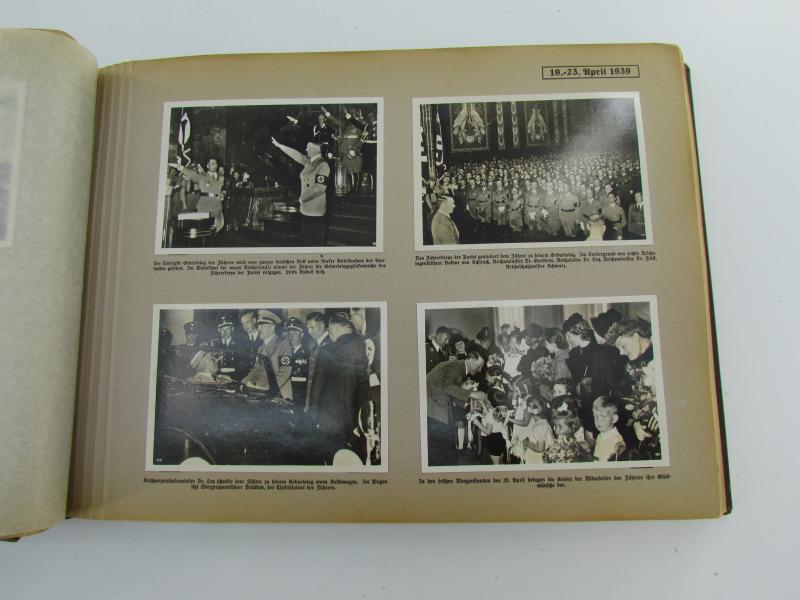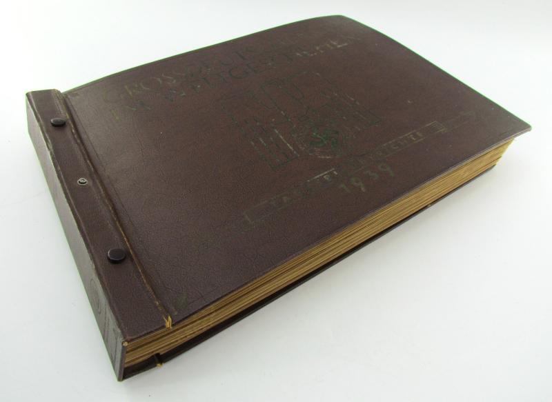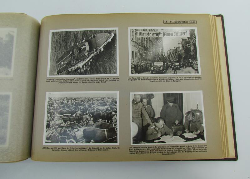 Published by the Reichs' Ministry for National Education and Propaganda, this album "Grossdeutschland im Weltgeschehen - Tagesbildberichte 1939" was intended to provide a reminder and an example to later generations of the 'heroic' sacrifices of the German nation in the "fight for freedom." The album contain photographs on a wide variety of subjects in the year 1940, and depict all aspects of life on the fighting and home fronts, including among others awards to heros, German military equipment, destroyed Allied equipment and aircraft, German troops in the field, railroad workers in lunch line, foreign visitors to Germany, German industry and assembly lines, German troops entering Paris, Adolf Hitler with generals, leading party personalities and much more ......