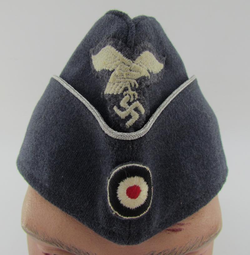 Luftwaffe Officer's Overseas Cap (Schiffchen für Offiziere). Luftwaffe blue woolen construction Enlisted Men's type overseas cap which has been "field"upgraded for officer's usage, having silver piping for officers ranks along the top edge of the fold down panels. The cap is having an original applied cap-eagle and black/white/red national tri-color cockade. The insignia are neatly period hand applied.