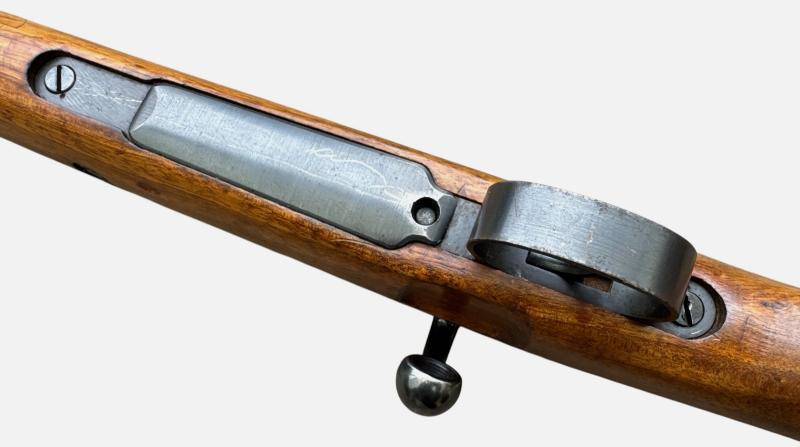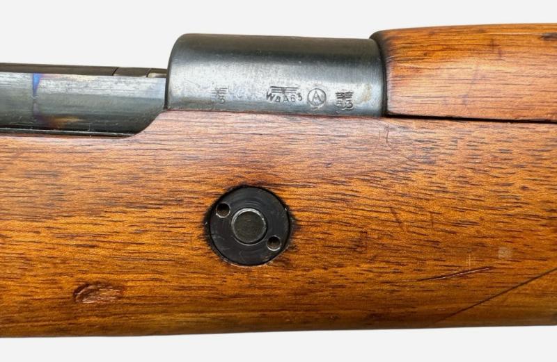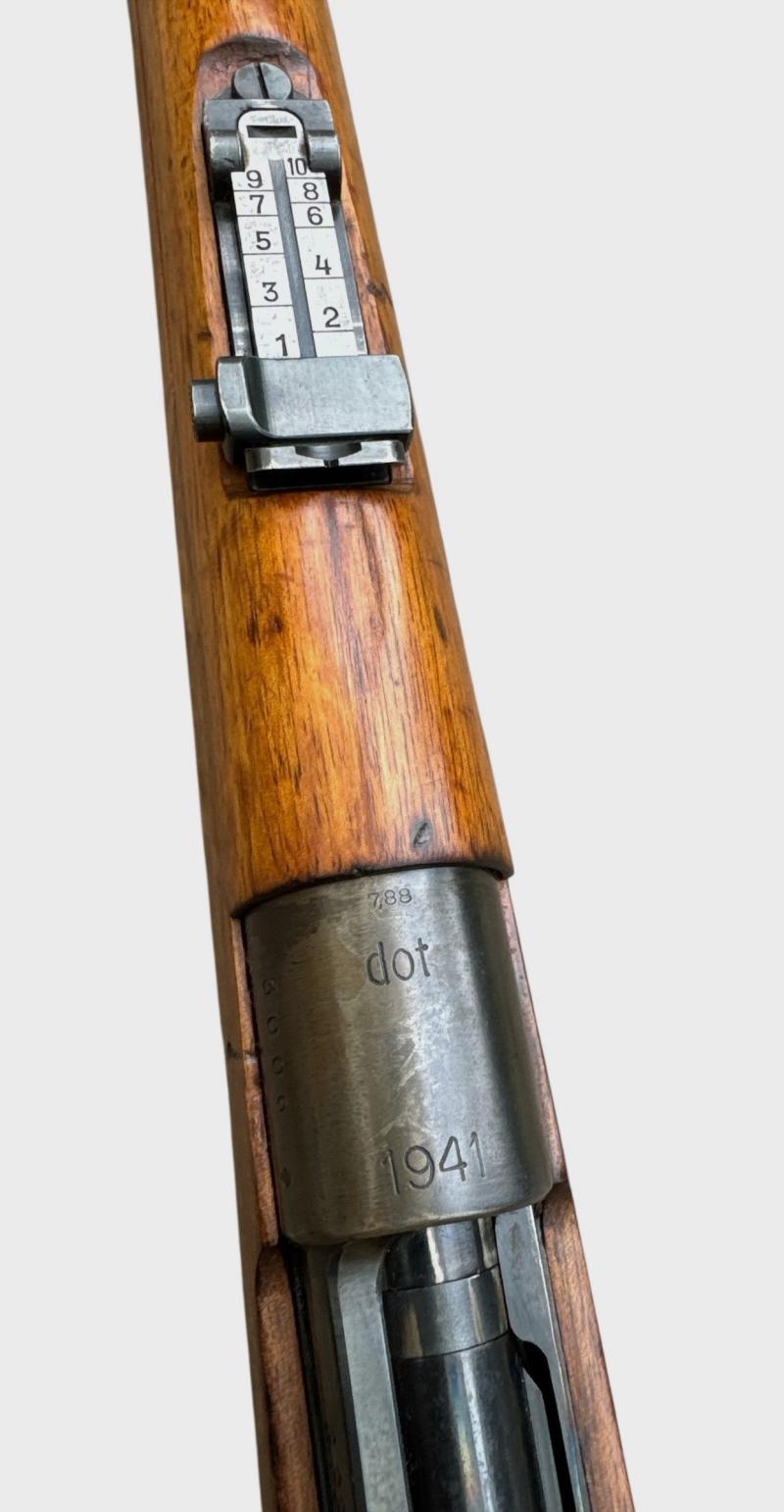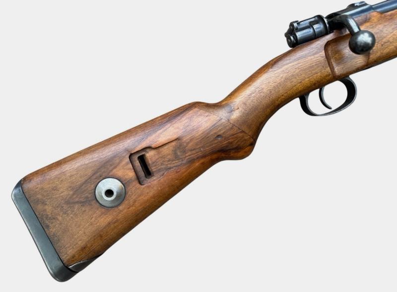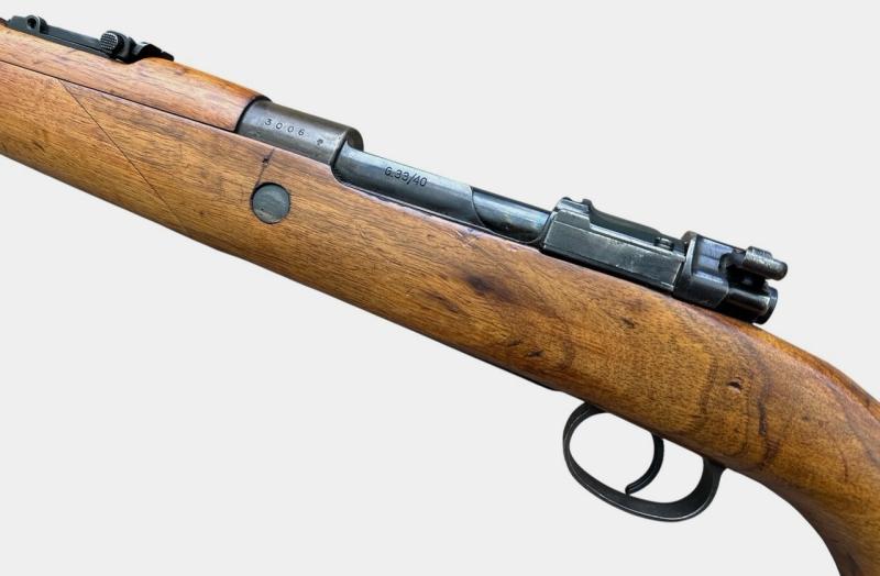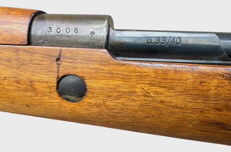 De G33/40 karabijn is speciaal ontworpen voor gebruik door berginfanterietroepen. Hoewel hij hetzelfde 7,92 mm kaliber gebruikt als de K98, verschilt hij aanzienlijk van de K98 door een opvallende metalen plaat aan de linkerachterkant van de kolf. Deze plaat diende ter bescherming tegen beschadiging in het veld, bijvoorbeeld bij gebruik als alpenstok, klimhulpmiddel of door ski- of sneeuwschoenen. De karabijn is ook aanzienlijk korter en heeft een andere houtbewerking, vizier en loopbanden. De grendel is lichter gemaakt en heeft een neerklapbare hendel. Deze karabijnen werden alleen geproduceerd in de Waffenbrik Brünn van 1940 tot 1942 en dragen het Waffen-keurmerk WaA63. Dit exemplaar heeft alle nummers die overeenkomen en de originele grendel! Een zeldzame vondst.