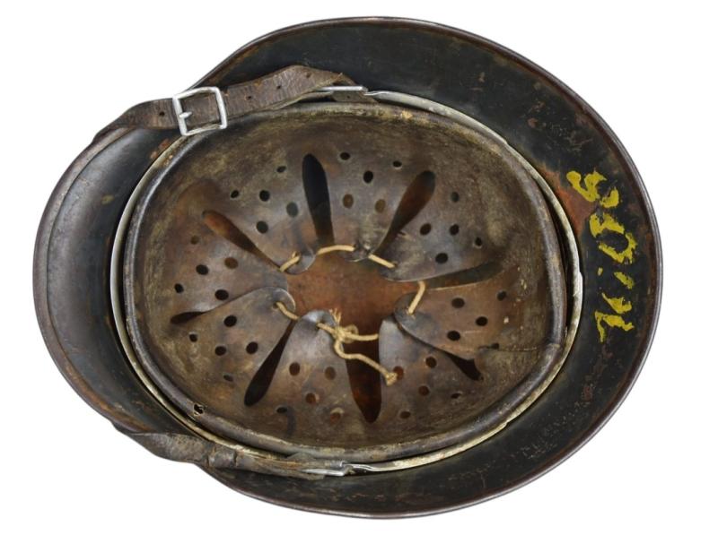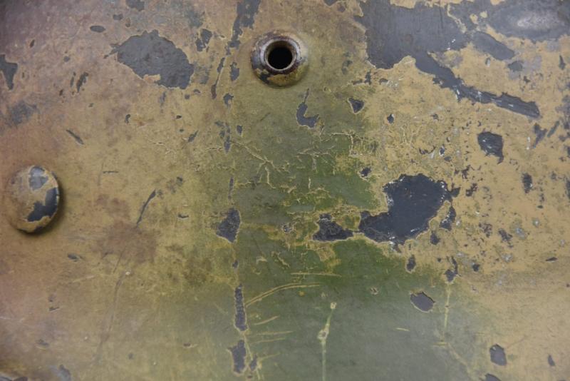 Very nice M35 steel helmet that came out of the factory as a double decal example in glossy blue paint. Got camouflaged during the war, covering both decals, but there shadow is still visible under the paint.