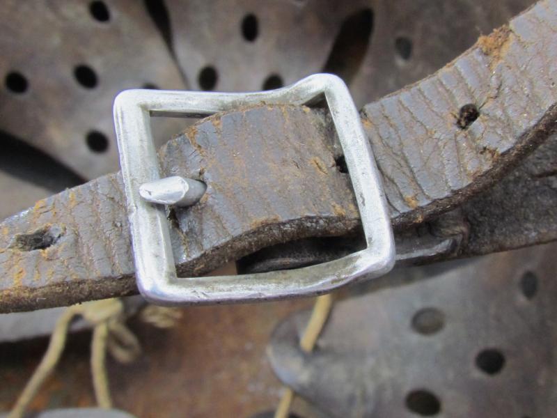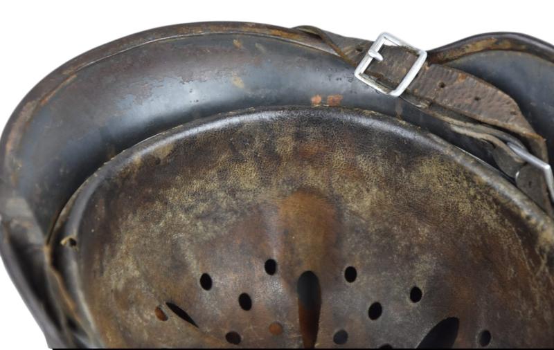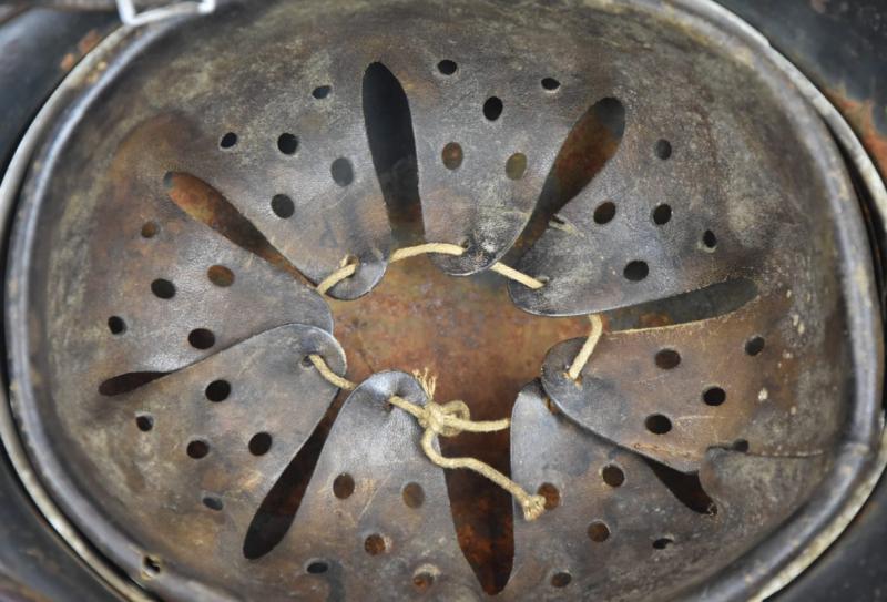 The inside remains perfect and untouched having a reinforced aluminum liner dated 1938. The leather is a bit stiff but remains strong. The genuine draw string and chin strap are still present. The strap is maker marked and dated 1938.( hard to read )