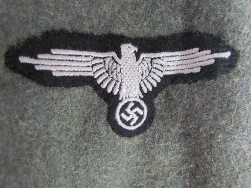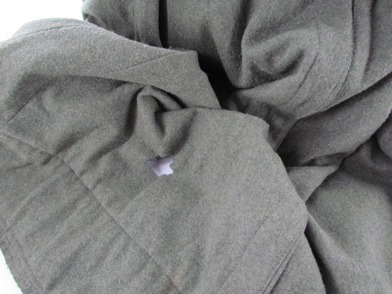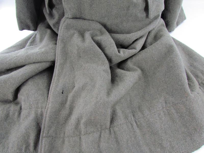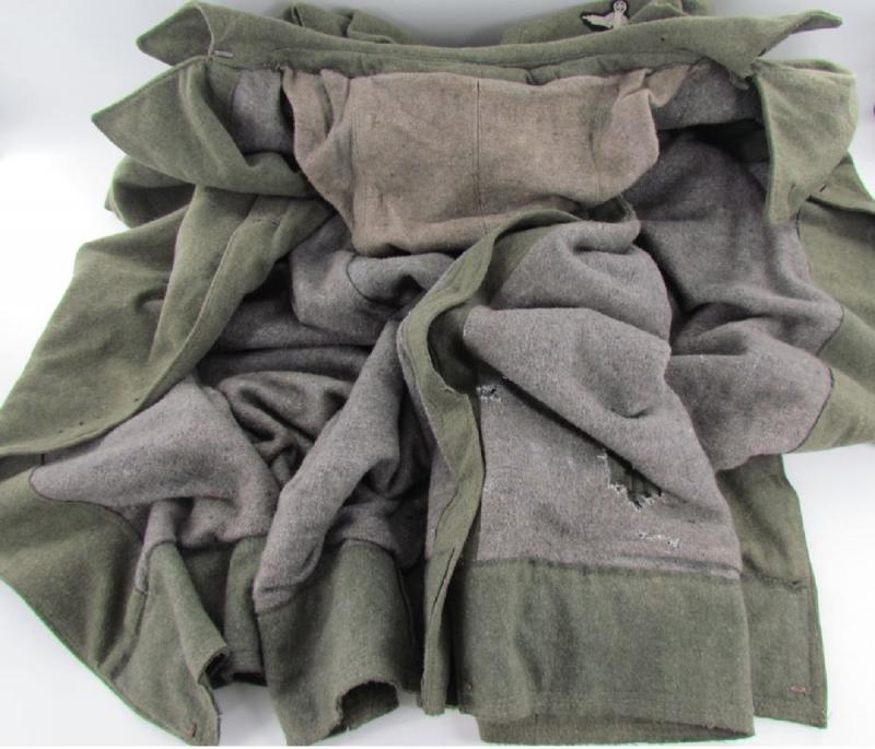 Greatcoat made of field gray wool with a large collar, RB number and number stamping in the inside pocket of the gray wool lining. Hand-sewn sleeve eagle. Some Moth holes and minor damage
