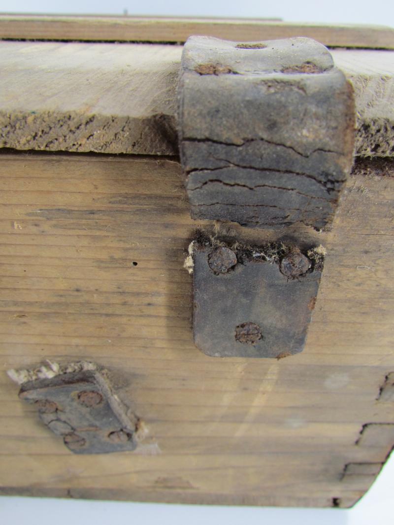 The box is in worn and used condition with the webbing strap removed, and the leather in hard condition with one leather strap on the backside broken ( hence the price ).