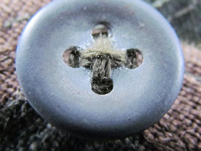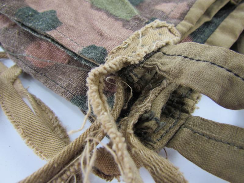 These trousers are a interesting late war mix of patterns. Like some late war SS trousers they feature belt loops but everything else is of the standard Keilhose model. These trousers are manufactured in a thin open woven cotton and feature steel and Italian resin buttons. The trousers are in light worn condition and appear to be unmarked. Interesting features are the handsewn button holes and the red line in the fabric like in the late war MP44 pouches. Also the strings at the bottom have been handsewn on the trousers, which indicates field repair which is a very nice touch!