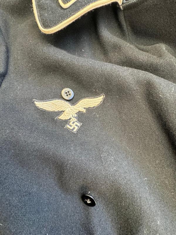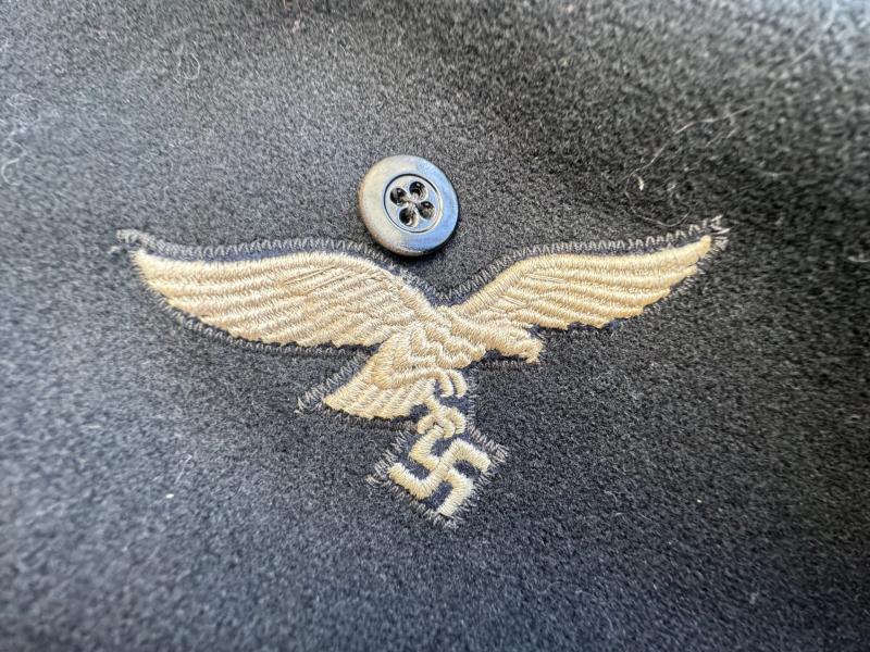 The uniform is the standard black Panzer tank uniform, but with Luftwaffe insignia and white piping instead of pink or yellow