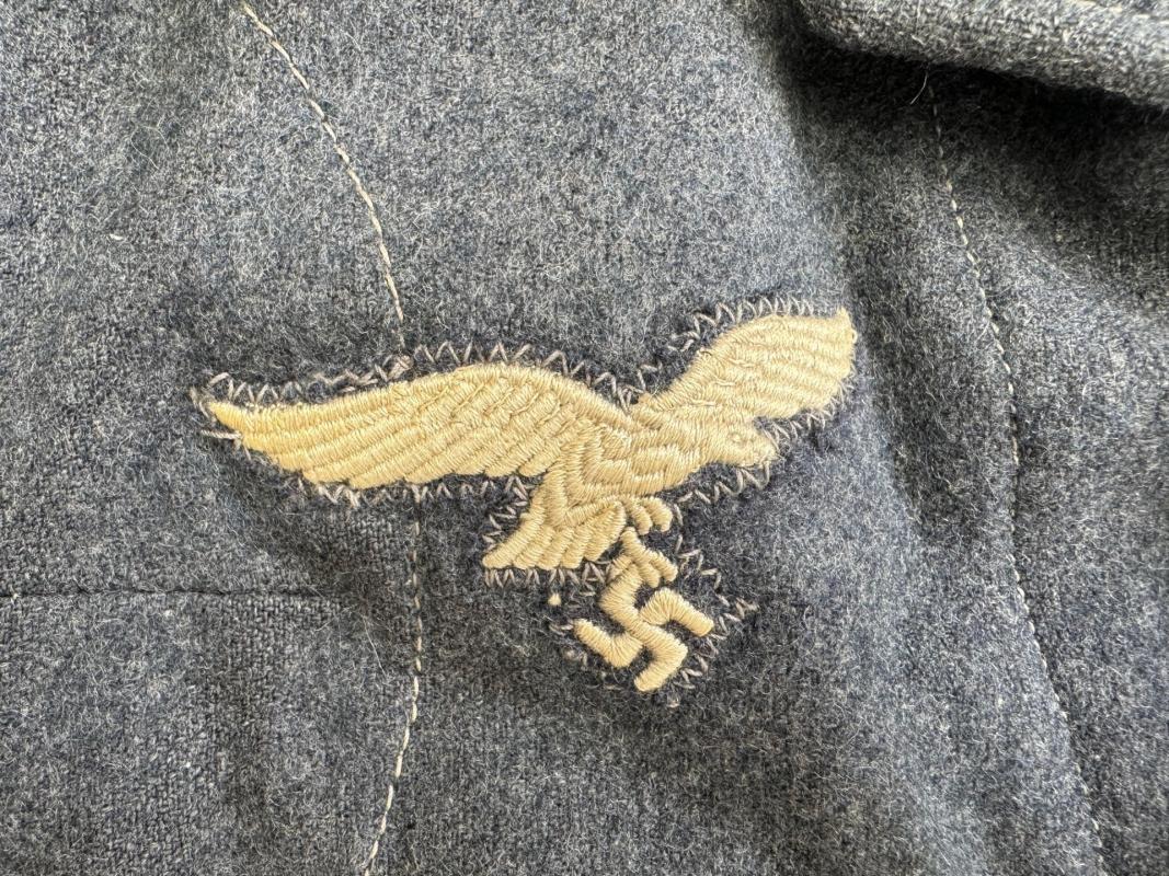 A nicely machine-embroidered Luftwaffe breast-eagle is nicely factory machine-sewn to the blouse