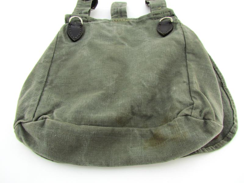 This is an example which is made of heavy quality teal-green coloured canvas, the breadbag is re-inforced with lacquered leather parts.