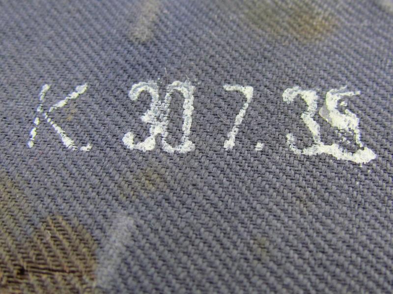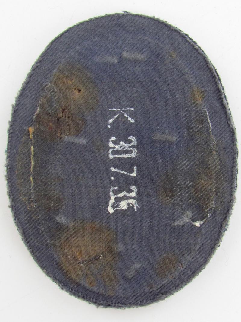 The insignia consists of a vertically oval, deep navy blue wool base with a single piece, gilt washed, stamped alloy, dual, diagonally angled, crossed, downward pointing, blitz arrows superimposed on a vertical anchor positioned over a single chevron