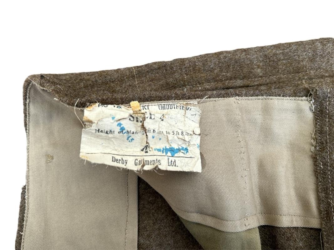 Maker marked “Derby Garments Ltd.” dated “1945” in very hood size “4” Overal fantastic pair of British WW2 Battle Dress trousers in very good condition. Hard to find with label inside! which is mostly gone!