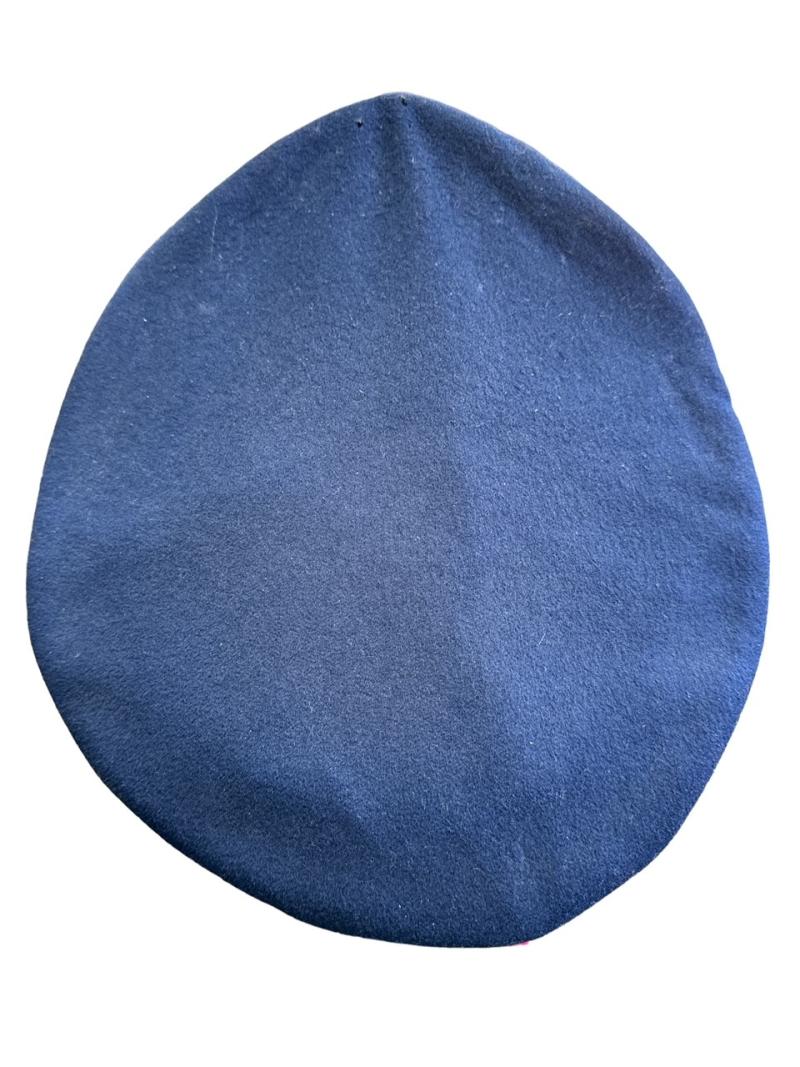 It is fabricated from very dark navy blue worsted wool cloth, with wide black velvet cap band, plus two rows of saddle carmine red (karminrot) color piping around the circumference.