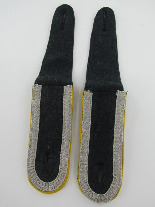(Luftwaffe Schulterklappen). A set of Luftwaffe Pilot/Paratrooper Unterfeldwebel shoulder straps, each constructed of blue-grey wool, trimmed with yellow piping, and bordered by silver aluminum wire tresses