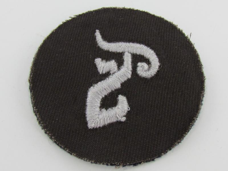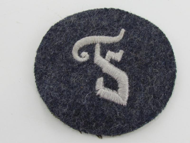 Here we have a machine embroidered gothic style, "F" for Feuerwerker, in silver/grey rayon threads on a round blue/grey wool base. unissued condition