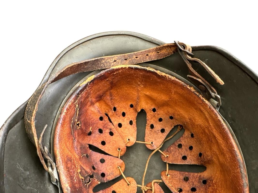 The stamped sheet steel construction M40 helmet retains almost all of its field-grey paint