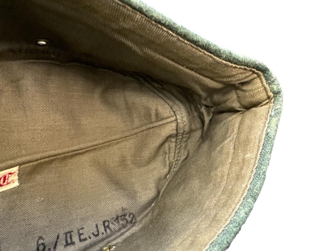 Enlisted Men's type overseas cap which has been upgraded for officer's usage, having silver piping for officers ranks along the top edge of the fold down panels.