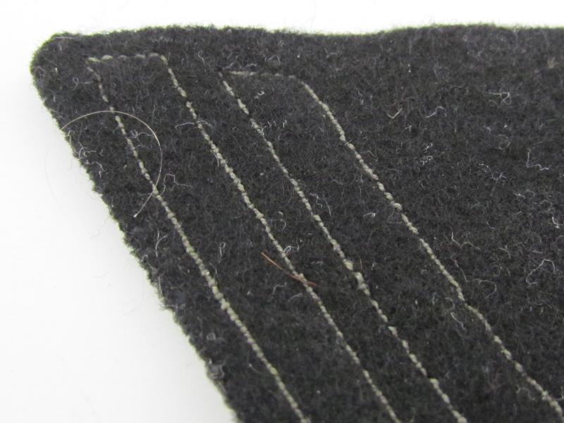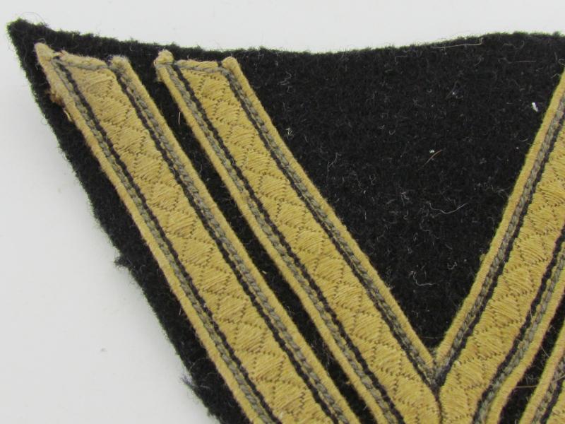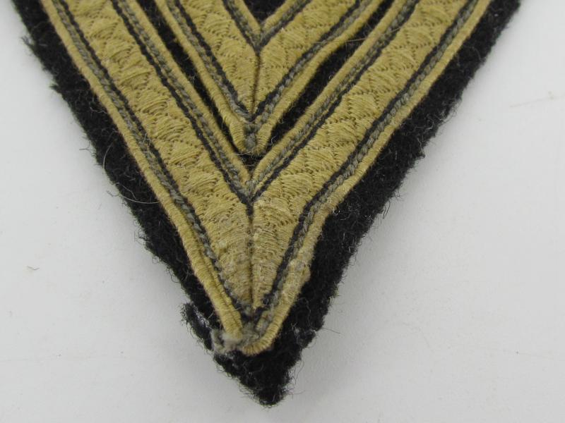 Waffen-SS arm-chevron intended for a 'Rottenführer', this is the tropical version. The chevron is executed in black wool having the yellow-coloured, sub-dued, NCO braid with two black lines.