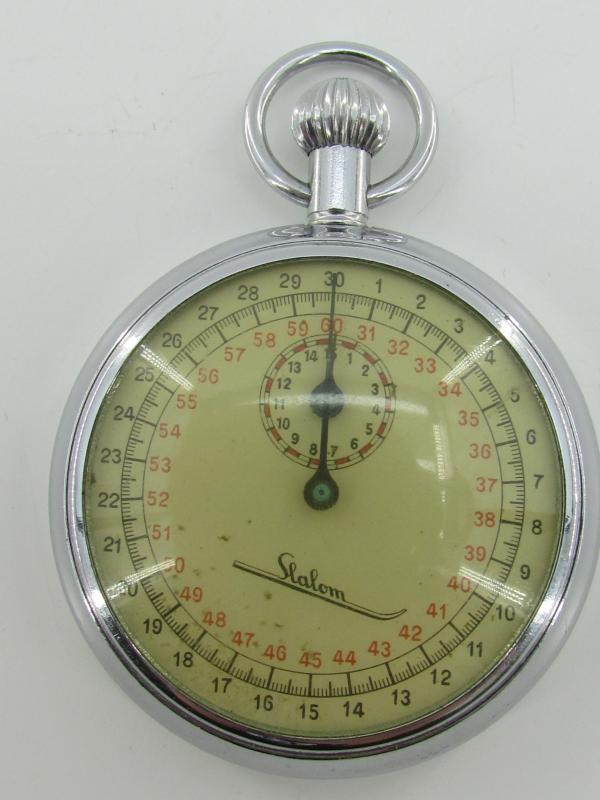 This Stop Watch still runs very nicely, and is housed in a Chrome-plated brass alloy case. The fluted knob on the top controls everything. You wind it up and when you push it in once the single seconds had starts moving immediately. On the second push, the second hand freezes at the time elapsed position. On the third push the timer resets itself to zero