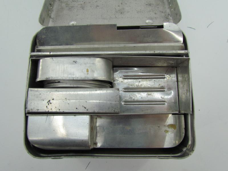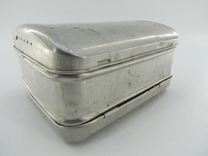 Rare original Wehrmacht Personal "Mica" Kit' (Soldaten Wirtschaftskasten). This kit was stored inside the mess kits and would contain all necessary personal items. The kit is complete with it's original inner frame. The aluminum kit is nicely marked with 'Mica' and nicely 'D.R.Patent, Auslandspatente' marked.