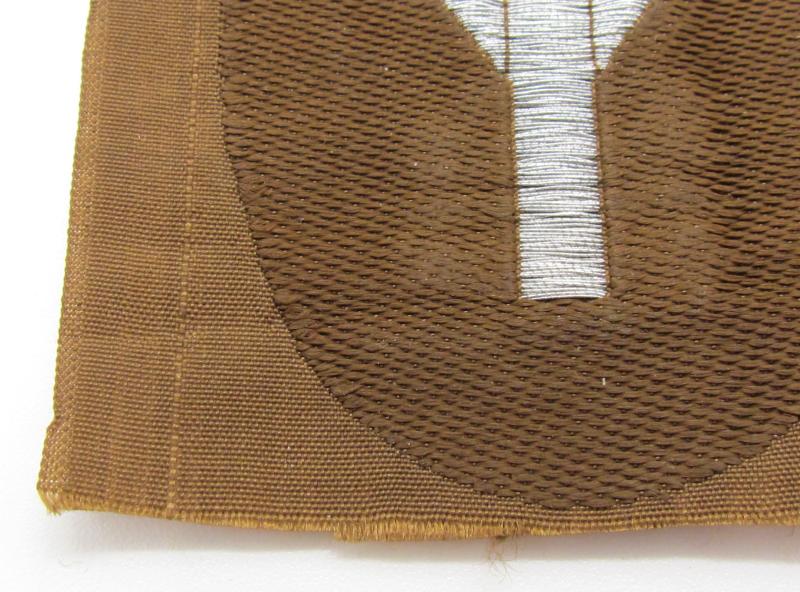 SA- ('Sturmabteilungen'-) related officers'-type armbadge ('Ärmelabzeichen für Führer') as was woven in silver-coloured- (so-called: 'BeVo flat-wire'-pattern) braid on a typical earthen-brown-coloured background as was intended for an: 'SA-Führer' ('Feldscher o. Arzt')