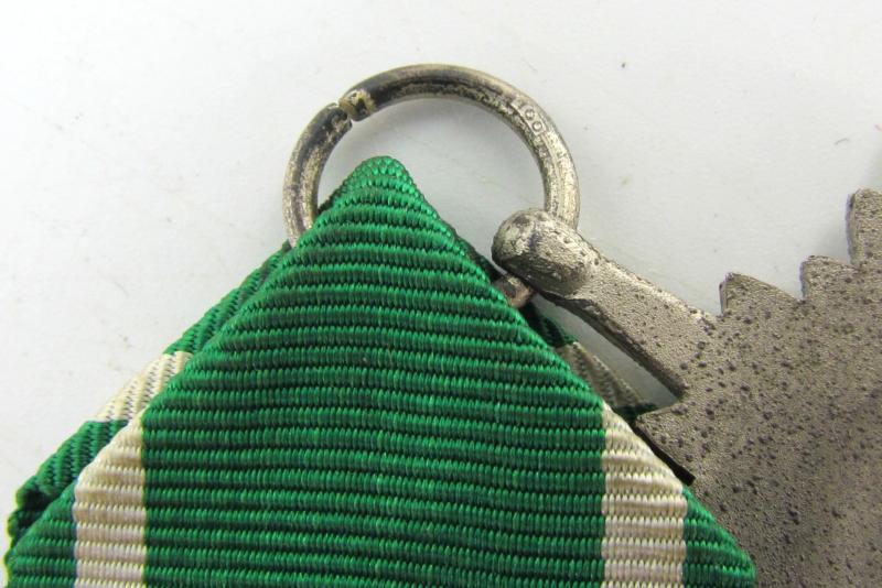 Eastern Peoples Award 2nd Class in silver with swords (Verdienstauszeichnung für Angehörige der Ostvölker, 2. Klasse in Silber). This series of awards was instituted on 14 July 1942 to recognize the contribution of volunteers from the Eastern European countries to Germany's war effort. The zinc type medal just shows some minor wear and great detail overall, it still retains almost all of its original silver finish. The medal is complete with its original confectioned ribbon as found.however, one side of the stitching holding on the pin is loose