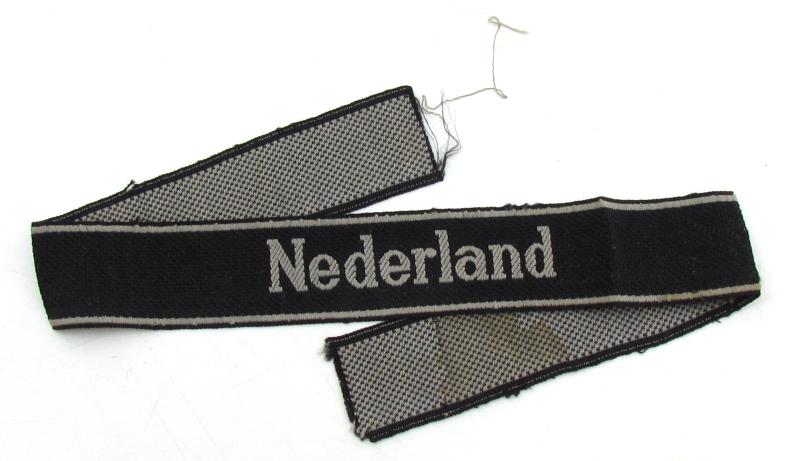 Waffen-SS BeVo-woven 'Nederland' cufftitle (Ärmelband).This is the Fourt and last pattern cufftitle as intended for members of the 'SS-Freiwilligen-Panzergrenadier-Brigade Nederland', woven in grey/white thread on black in the so-called 'BeVo' weave, the back of the cufftitle shows the salt-and-pepper design. The cufftitle shows the woven script 'Nederland'. The cufftitle is in full length condition with typical unfinished ends and measures approximately 43cms in length.