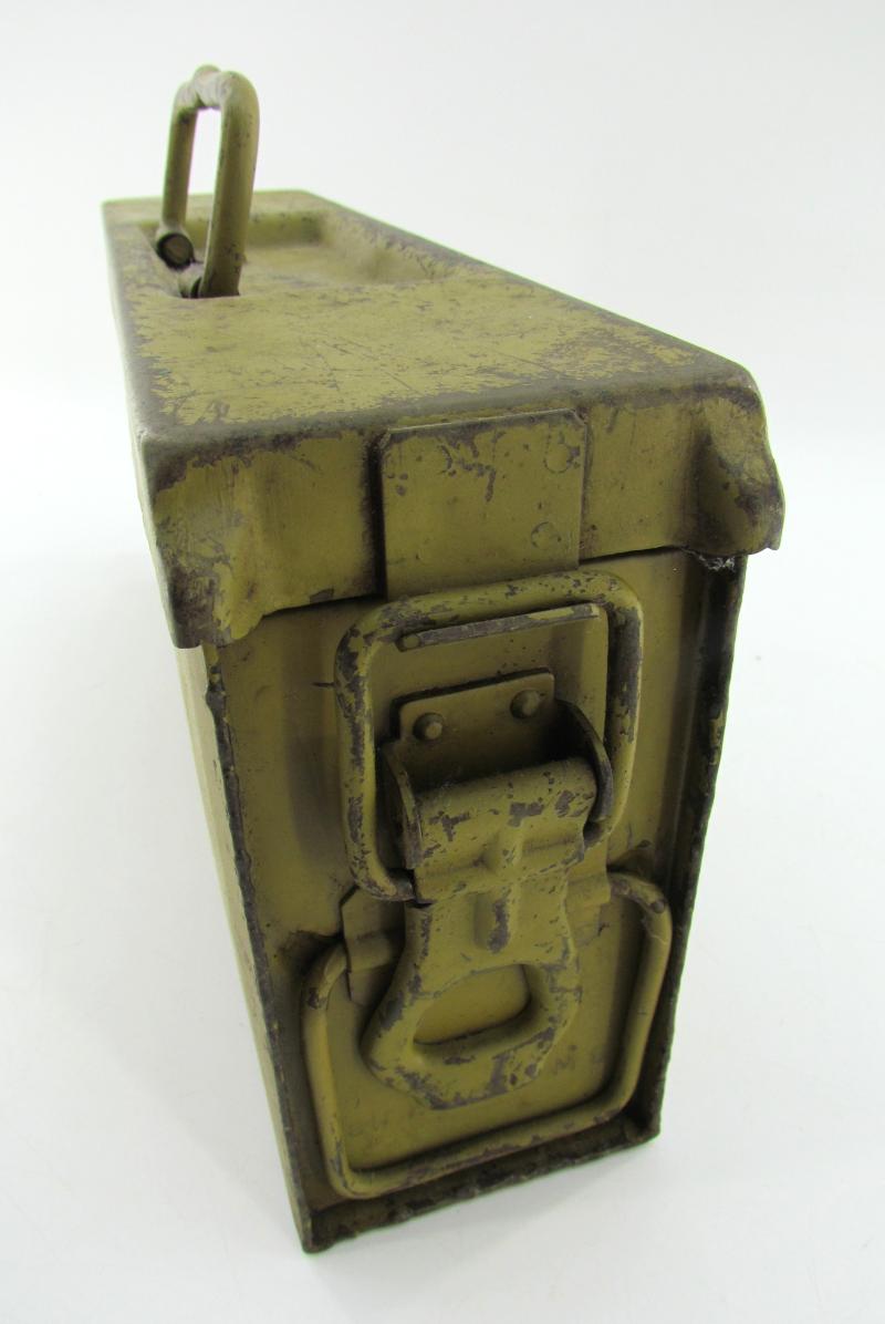 This case is a late war steel example having nice tan coloured paint, the case is showing some normal scratches caused by usage. The box is complete with original rubber inside the lid. The box is nicely marked with 'Patr.Kast.41.f.M.G